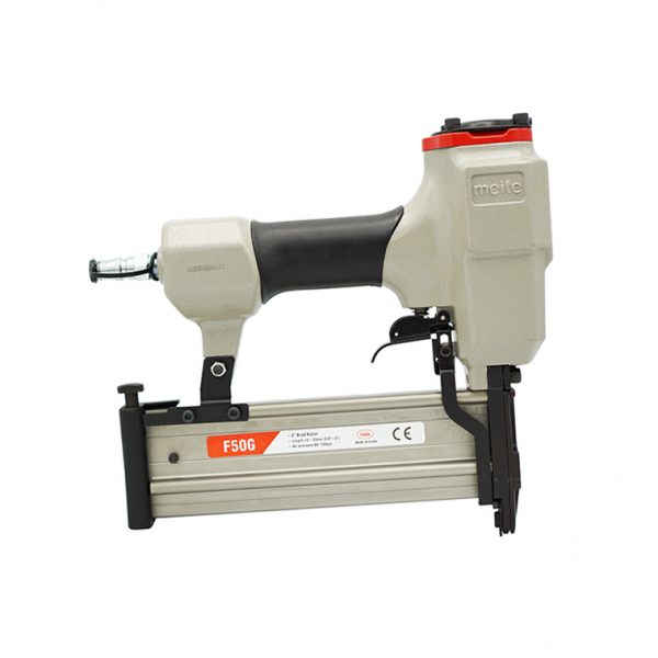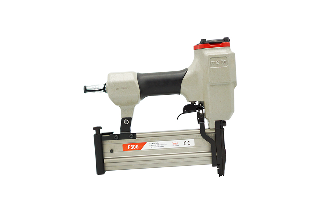 High quality brad nailer from MEITE, one of the largest manufacturers of pneumatic gun and staple in China. Robust and well-balanced body with a non-slip rubber grip. Designed to be used for furniture-making, upholstery, interior decoration, cabinet, etc. Compatible with F50 nail.