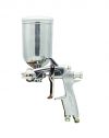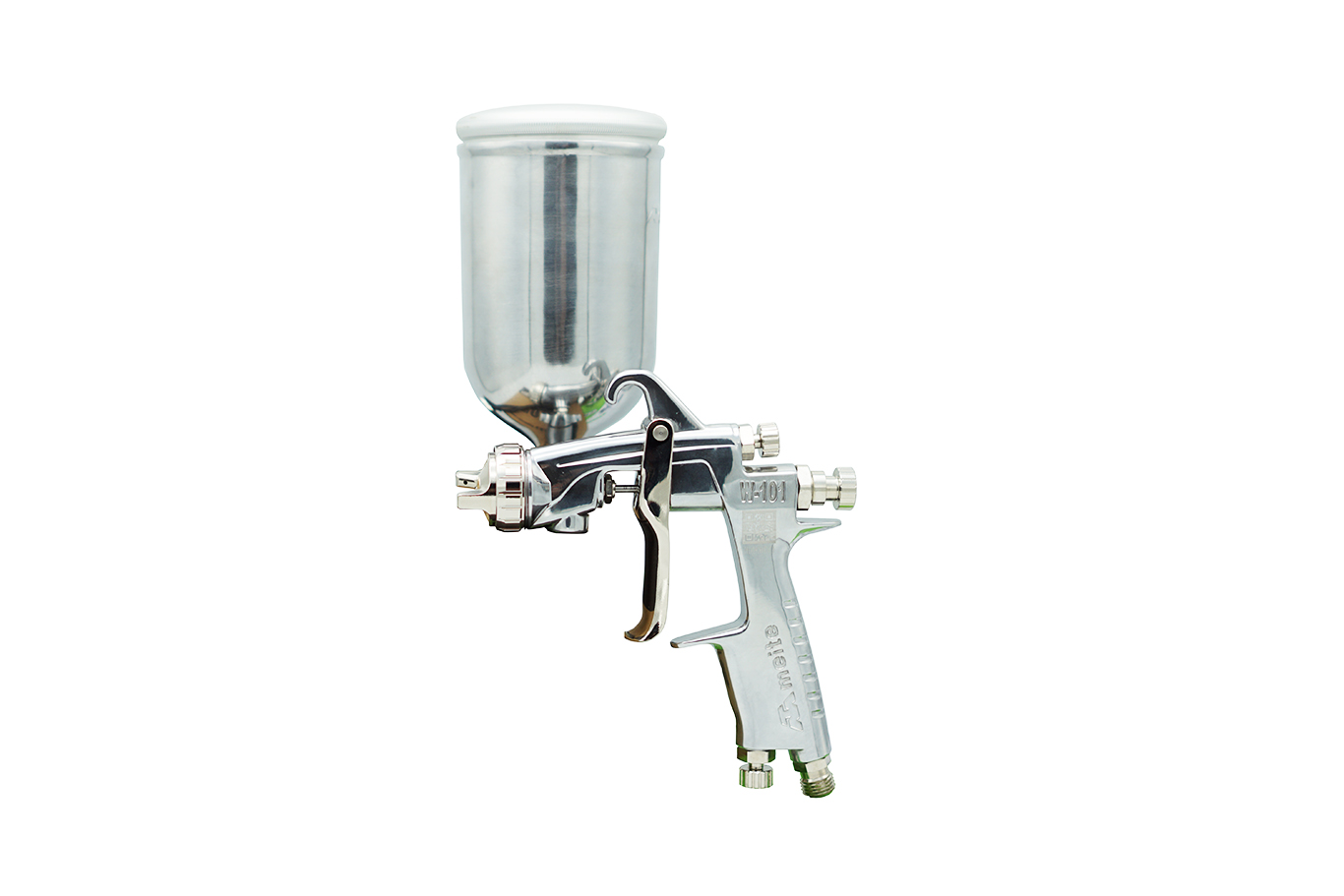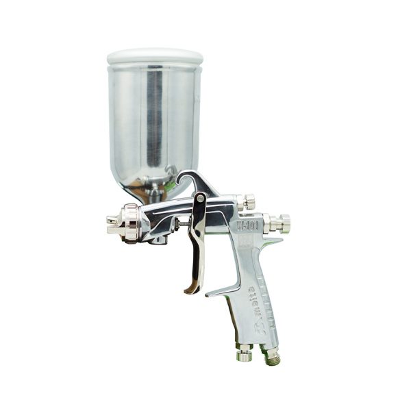 High performance HVLP gravity spray gun from MEITE. Come with 400 ml. sturdy aluminum cup. The model produces the finest particle and full atomization. Operated with air compressor.