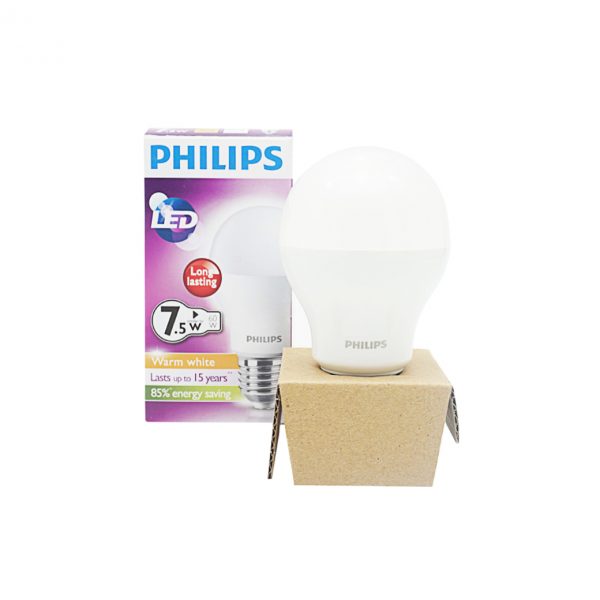 A PHILIPS LED light bulb offers warm white light. Typical design with up to 85% energy saving and up to 15 years longevity. Suitable for interior use.