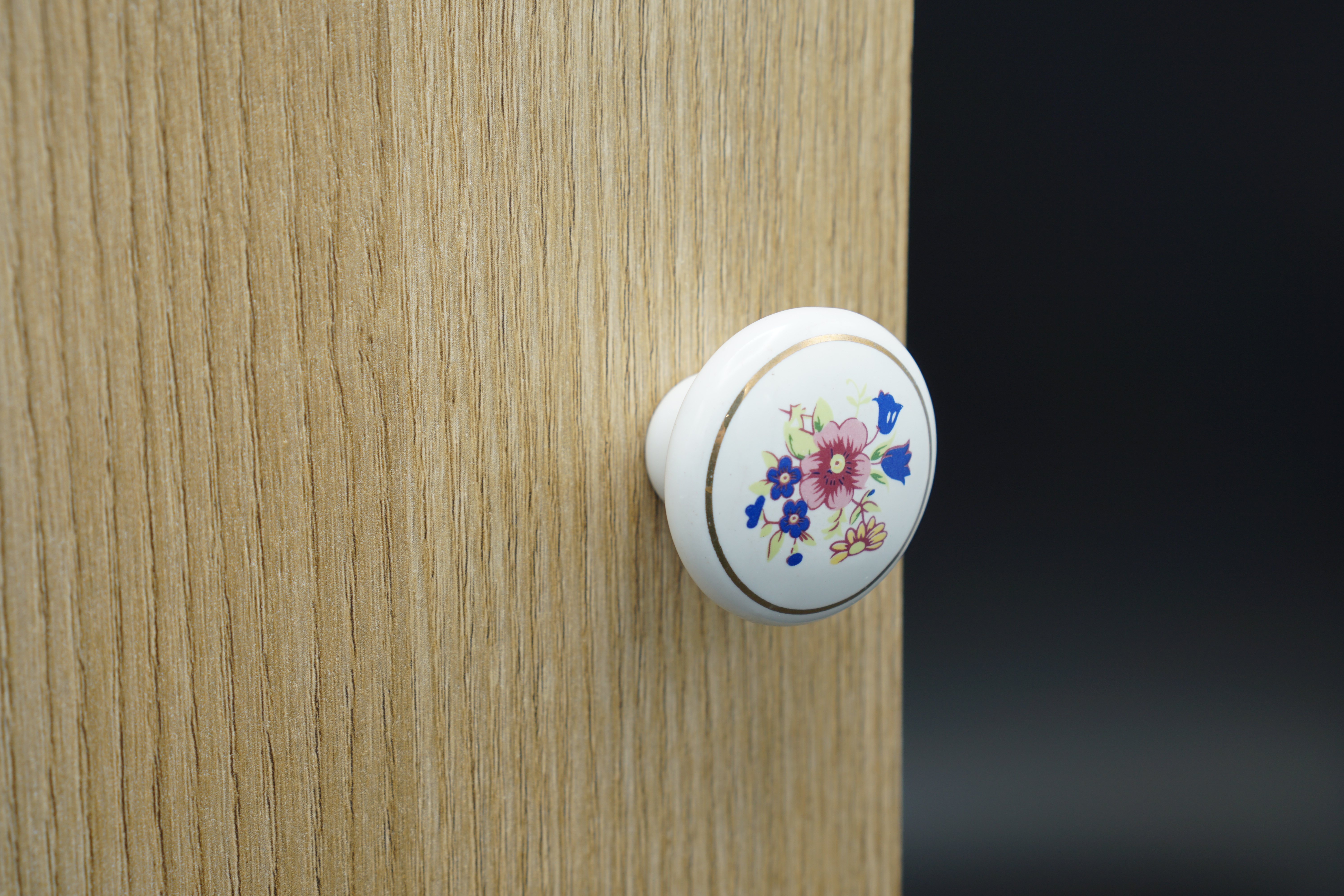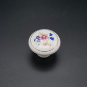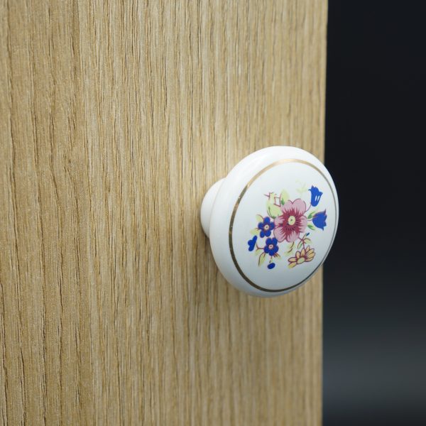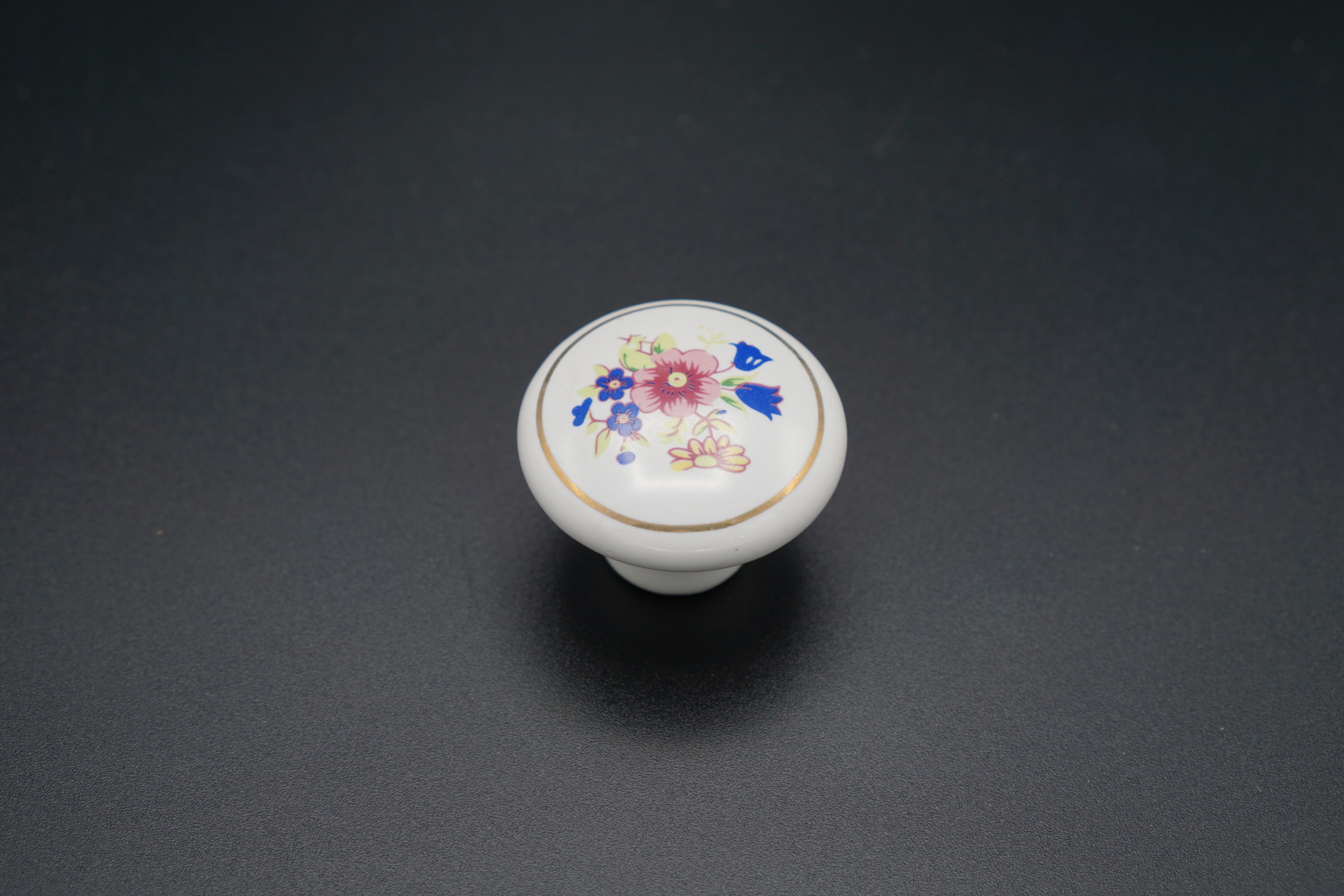 ปุ่มจับเซรามิคลายดอกไม้หลากหลายสี พื้นขาวเงา ขอบวงสีทอง เหมาะสำหรับติดตั้งกับตู้และลิ้นชัก